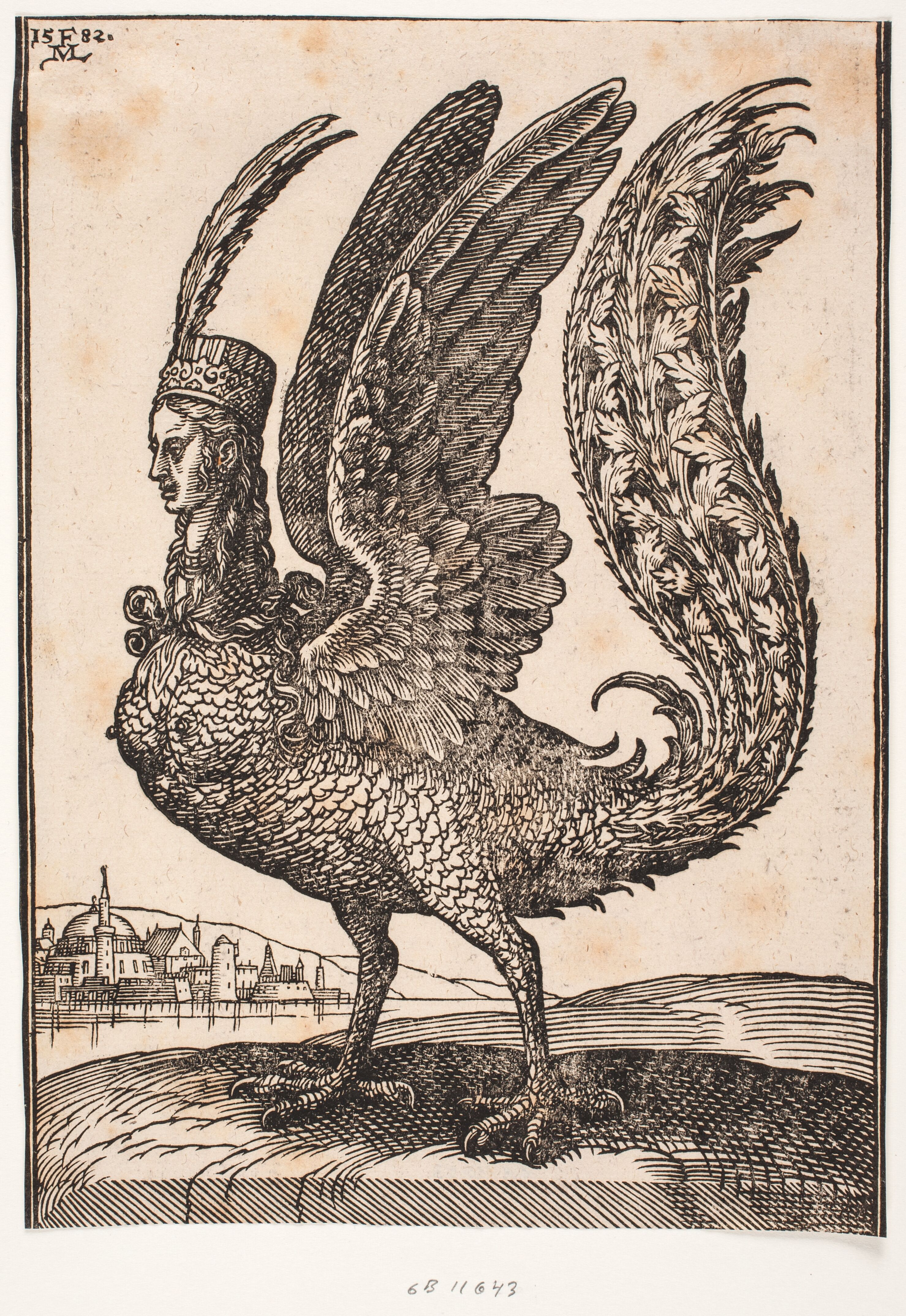 Etching of a woman with flowing hair caught in a spider web, arms outstretched, titled 'Arachne'