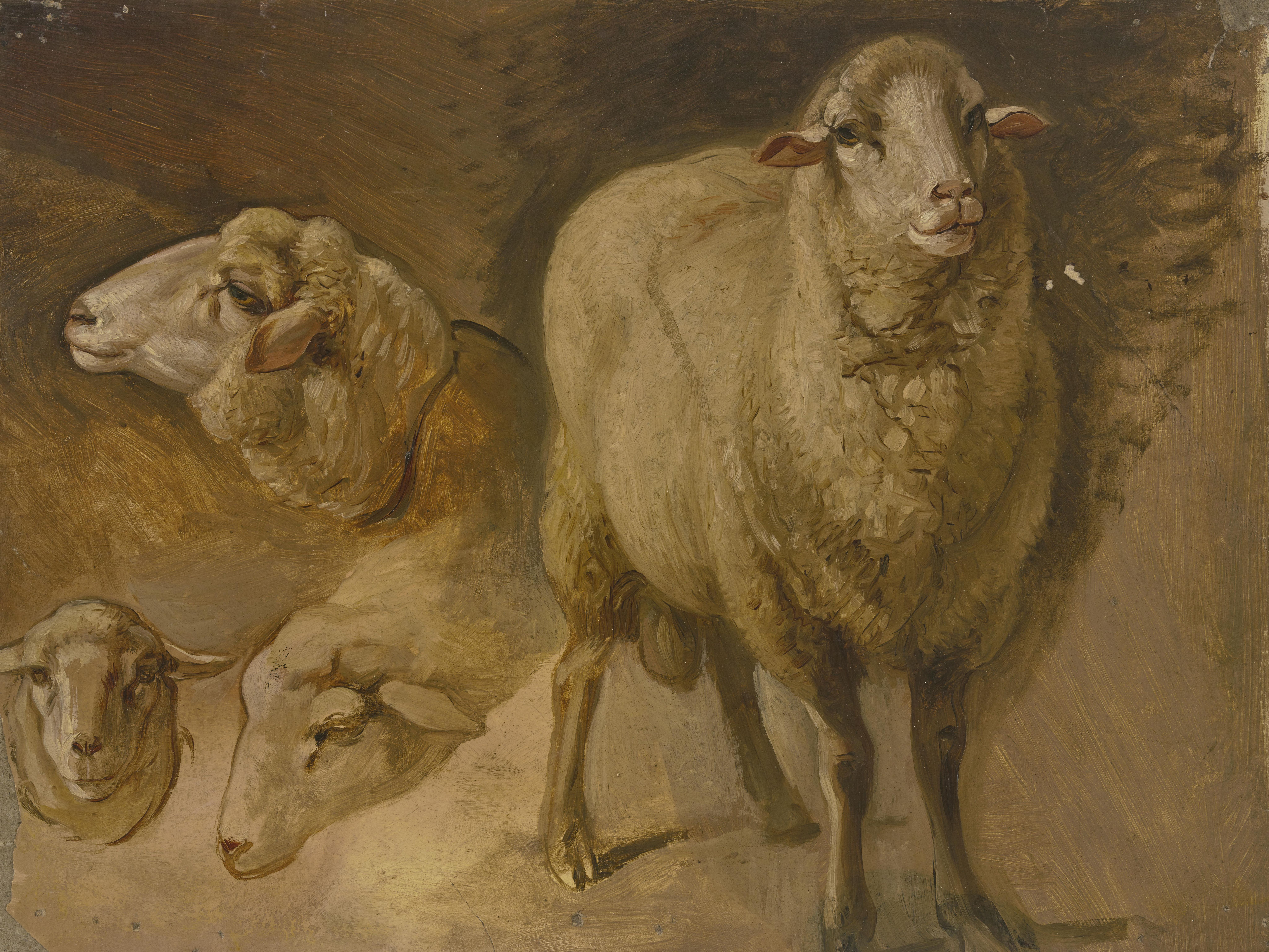 Oil painting showing four sheep in warm earth tones, with two prominent sheep in foreground and two smaller ones behind
