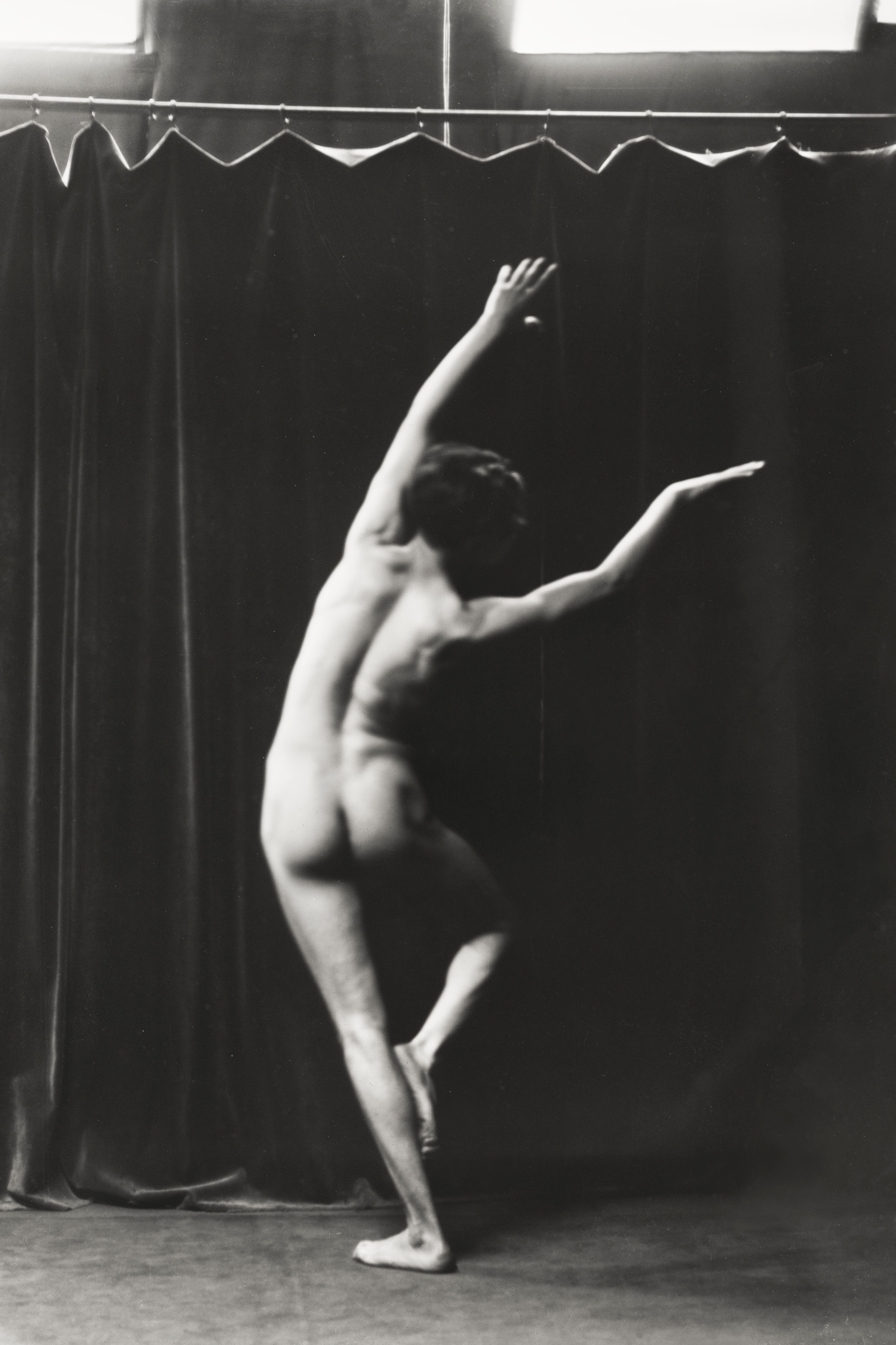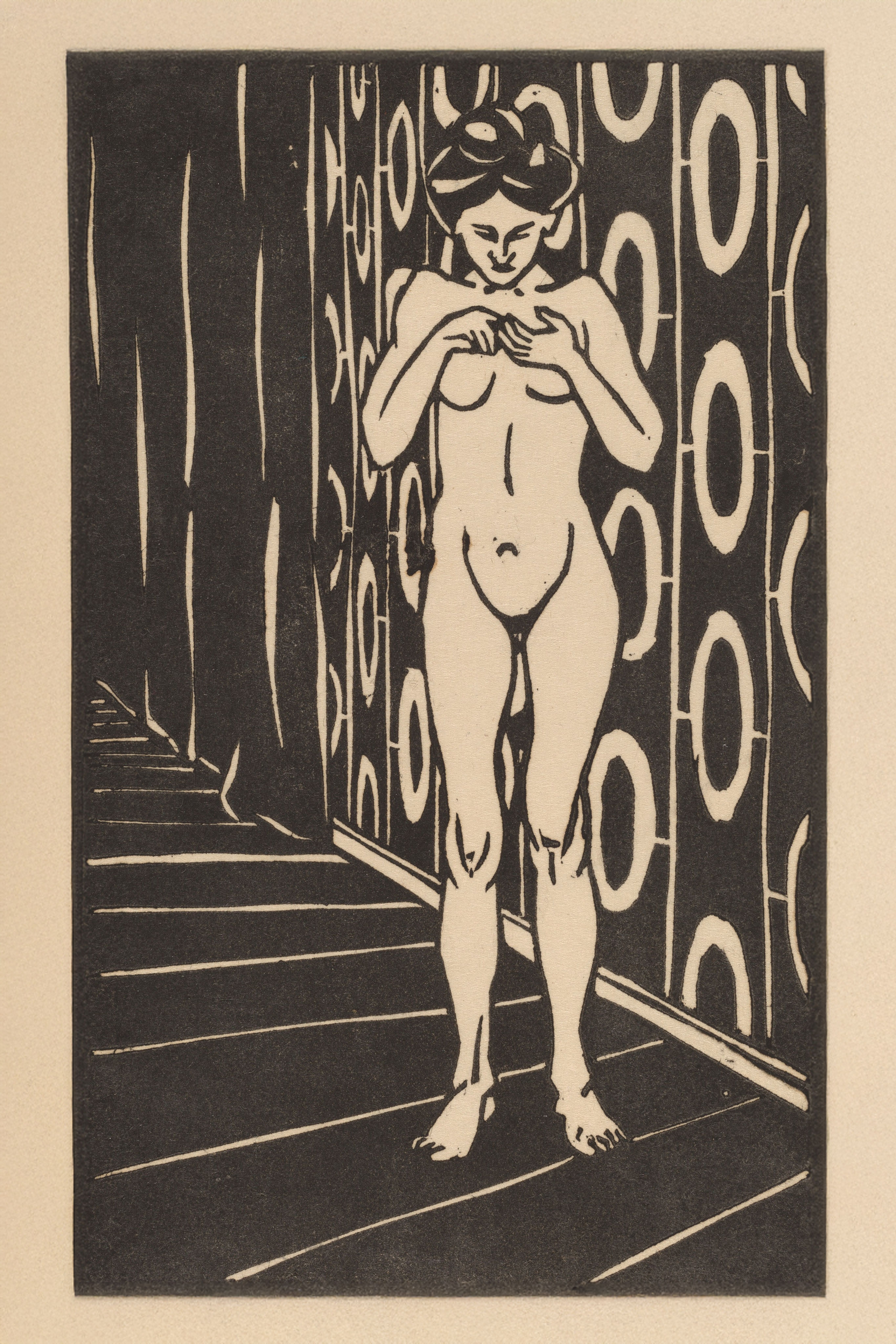 Black and white woodcut print of a nude female figure standing in an interior with decorative patterned elements